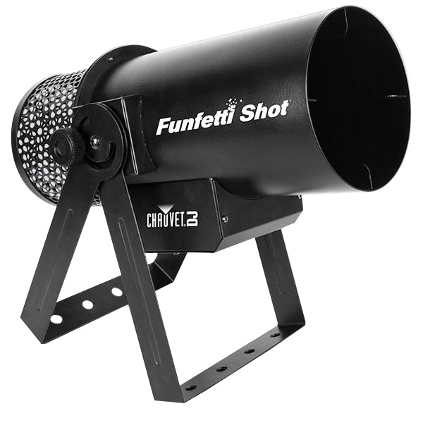 The CHAUVET DJ Funfetti Shot is a professional confetti launcher and its easy, single person setup and operation make it perfect for concerts, parties or other special events. Just add confetti! No compressed air or CO2 required. The Funfetti Shot works with Funfetti Shot Refill – Color, Funfetti Shot Refill – Mirror, and Funfetti Shot Refill – UV, as well as most other confetti types. It is easily controlled from the display, the included wireless remote or DMX. The Funfetti Shot includes a double bracketed yoke for easy floor mounting or hanging on TRUSST and fits best in the CHS-50 VIP Gear Bag.