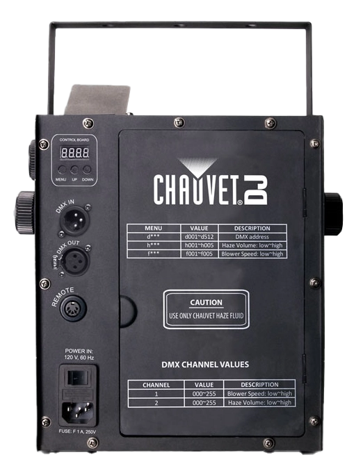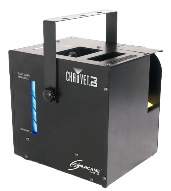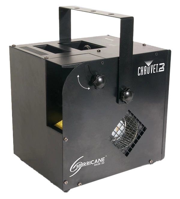 Hurricane Haze 2D is a water-based haze machine with continuous output and a digital display to set DMX and stand alone functions with ease. It features adjustable blower output speeds and nozzle to get the haze where you need it. The low fluid indicator gives a warning before running out of fluid. An included wired, timer remote stores conveniently in the fixture.