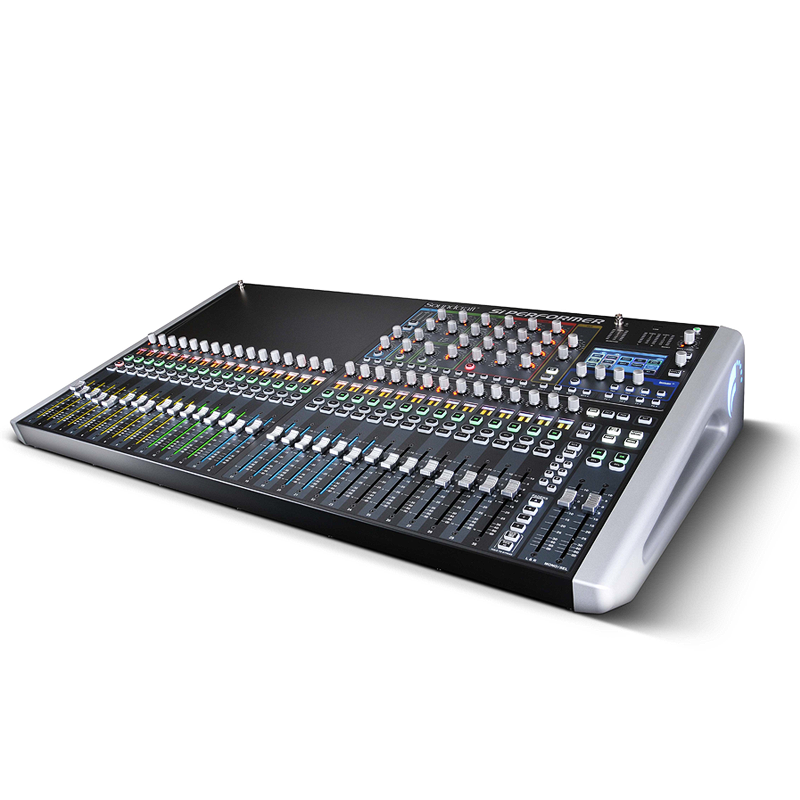 The Si Performer 3 features 32 local recallable mic pre amps and 8 stereo inputs along with two ViSi Connect™ option card slots with an additional 128x96 input/output paths (one 64x64 expansion slot and another 64x32 expansion slot). Able to utilize Si series ViSi Connect™ option cards, the Si Performer gives a large range of additional digital I/O connectivity including the MADI USB Combo, BSS Digital Audio Bus (BLU Link), Dante™, CAT5 or optical MADI, AVIOM™, CobraNet™ and others with a massive mix capacity of 64 mono inputs for a total of 80 inputs to mix. Each input channel has dedicated processing for high pass filter, input delay, gate, compressor and parametric EQ. Keeping you in control are 8 VCA busses, 8 mute groups, FaderGlow and color backlit name displays on every channel so you are never lost.